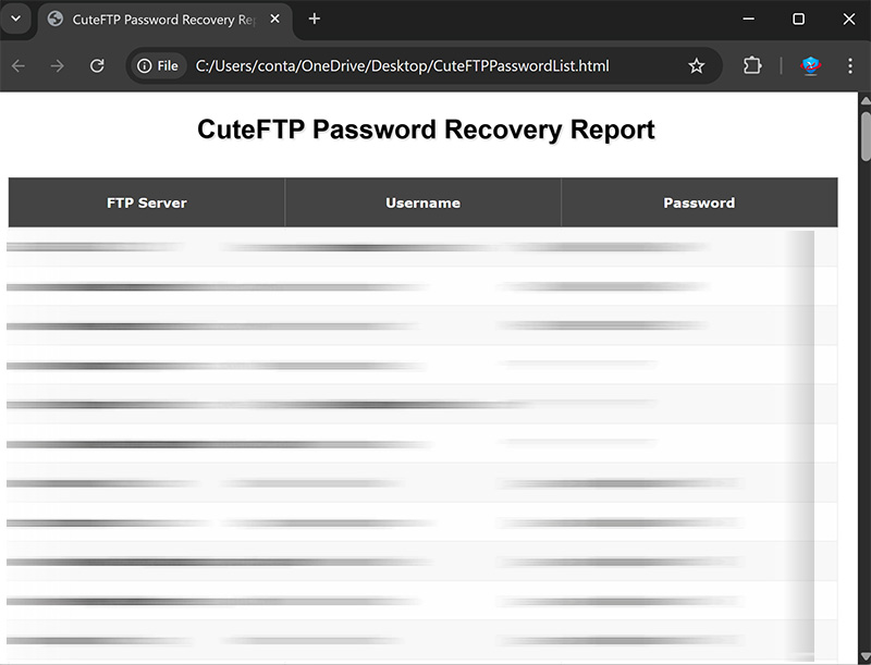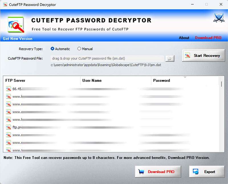 CuteFTP stores the password for all the past FTP sessions in user profile location so that user don't have to enter it every time. CuteFTP Password Decryptor makes it easy to quickly scan & recover all these stored FTP login passwords.